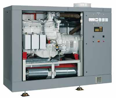 Mit einem stationären Verbrennungsmotor, einer kleinen Gasturbine oder einer Brennstoffzelle wird Strom erzeugt.