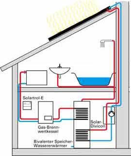 Über einen Solarkreislauf werden Kollektor, Speicher, konventionelle Heizung und die Warmwasserversorgung miteinander verbunden.